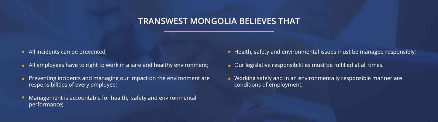 Transwest Mongolia provides world class products and services to our customers across Mongolia. As an organization, we recognize that being world class not only applies to the products and services we provide to others, it also applies to all aspects of our business including how we manage health, safety and the environment.